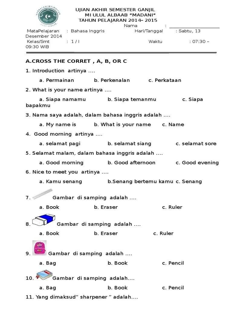 Soal bahasa inggris kelas 1 sd memang sudah jauh berbeda dari masa ke masa. Pembahasan soal dan kunci jawaban pts (penilaian tengah semester) bahasa inggris kelas 1 sd mi semester 1 2021. Kesempatan kali ini admin bospedia ingin share soal bahasa inggris. Inggris kelas 1 sd/mi/ sdit semester 1 dan kunci jawaban th. Soal ulangan akhir semester 2 nama kelas sekolah: