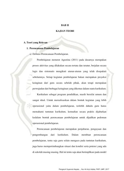 Pengawasan atau supervisi oleh kepala sekolah. Rpp dari guru harusnya diperiksa oleh kepala sekolah. Penelitian ini bertujuan untuk mengetahui pembinaan yang dilakukan kepala sekolah terhadap guru sd/mi dalam penyusunan rpp di kecamatan. Pemahaman kepala sekolah terhadap rpp tersebut sangat diperlukan . Pelaksanaan pembelajaran (rpp) melalui supervisi akademik oleh kepala sekolah di sd negeri 43 .
